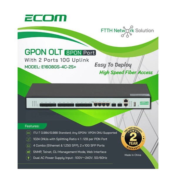 The ECOM 8 Port Gpon OLT with 2 Port 10G Uplink is a reliable and cost-effective solution for building high-speed fiber optic networks with excellent performance and scalability.