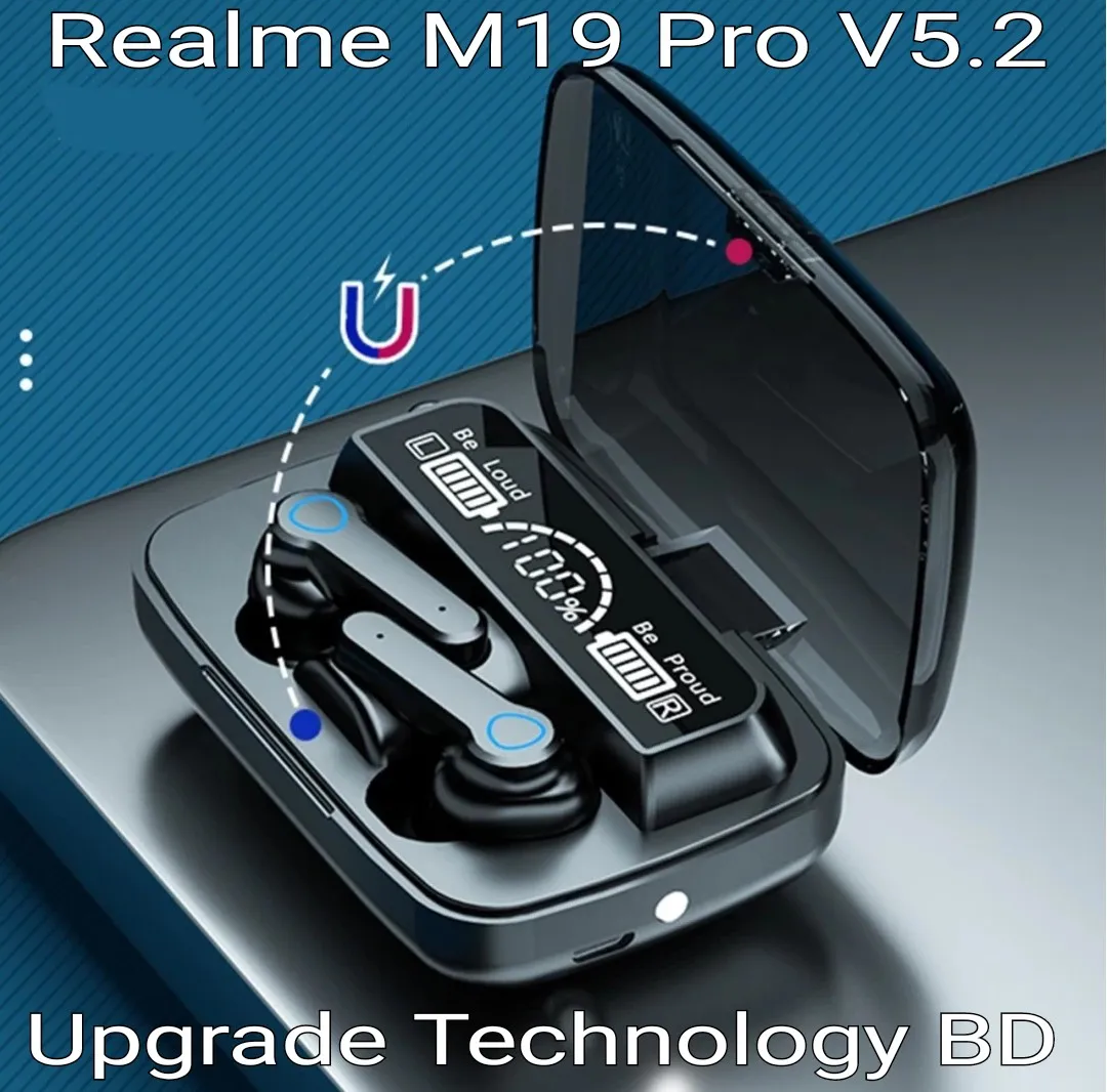• Realme TWS M19 Pro Ear-buds Bluetooth 5.2 Earphones Charging Box. M19 Pro Wireless Gaming Air-dots Bluetooth 5.2 Ear-buds Finger Touch Control.